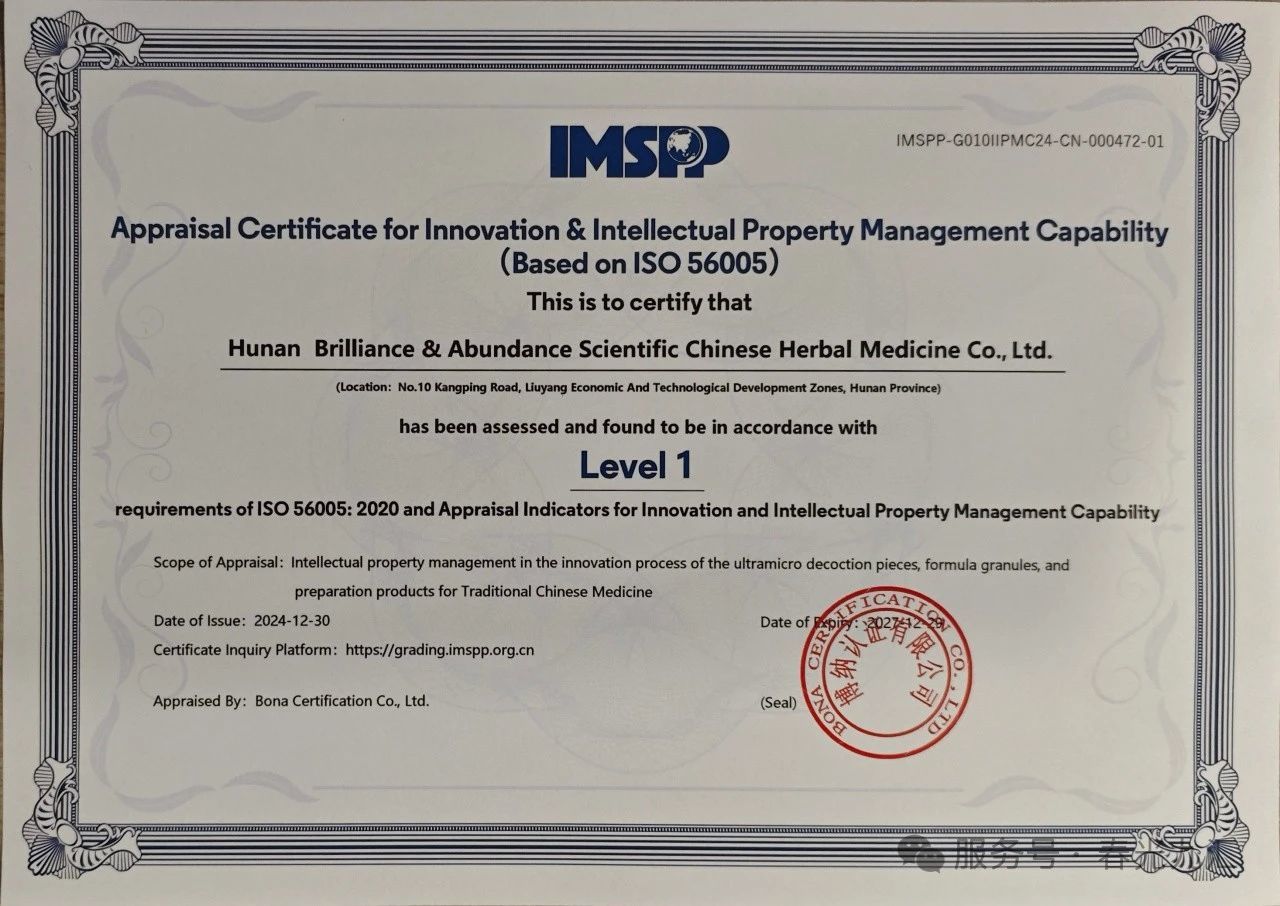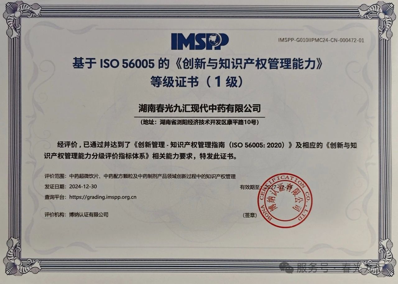ISO 56005《創(chuàng)新管理—知識產(chǎn)權管理指南》國際標準,系我國率先倡議并推動,經(jīng)由ISO正式立項、制定及發(fā)布的全球首個專注于創(chuàng)新與知識產(chǎn)權管理的國際標準。該標準以創(chuàng)新價值的最大化為核心目標,深度融合創(chuàng)新管理與知識產(chǎn)權管理,將知識產(chǎn)權管理活動全面貫穿于創(chuàng)新活動之中,旨在提升企業(yè)的創(chuàng)新管理能力與知識產(chǎn)權創(chuàng)造水平。公司積極實施ISO 56005標準,不僅有力響應了國家“一帶一路”倡議,還顯著加速了知識產(chǎn)權戰(zhàn)略與國際先進標準的接軌進程,為業(yè)務的全球化拓展及中藥國際化戰(zhàn)略的實施奠定了堅實基礎。